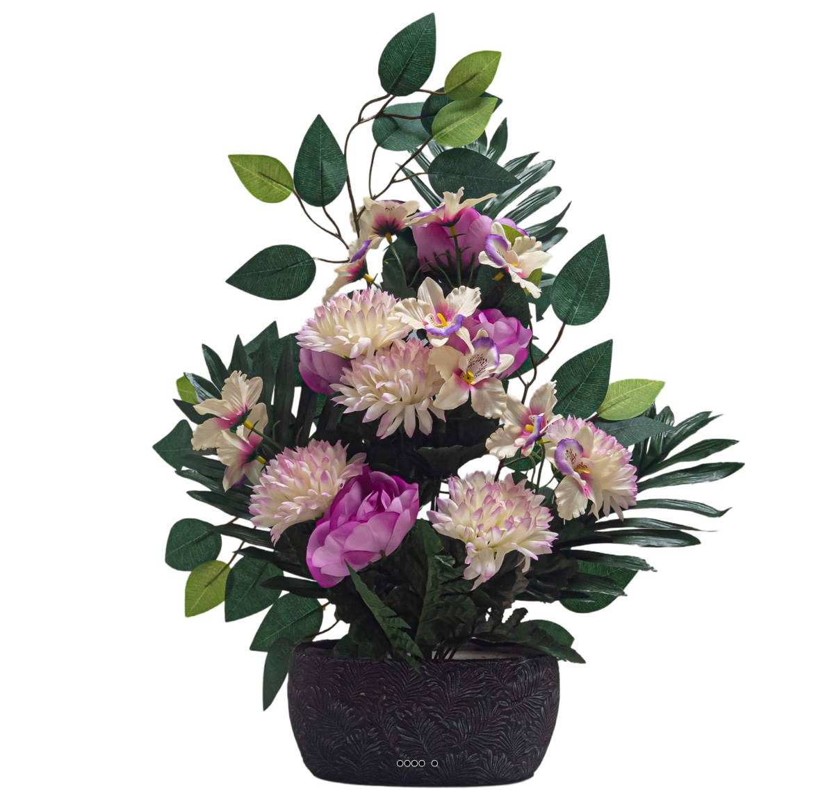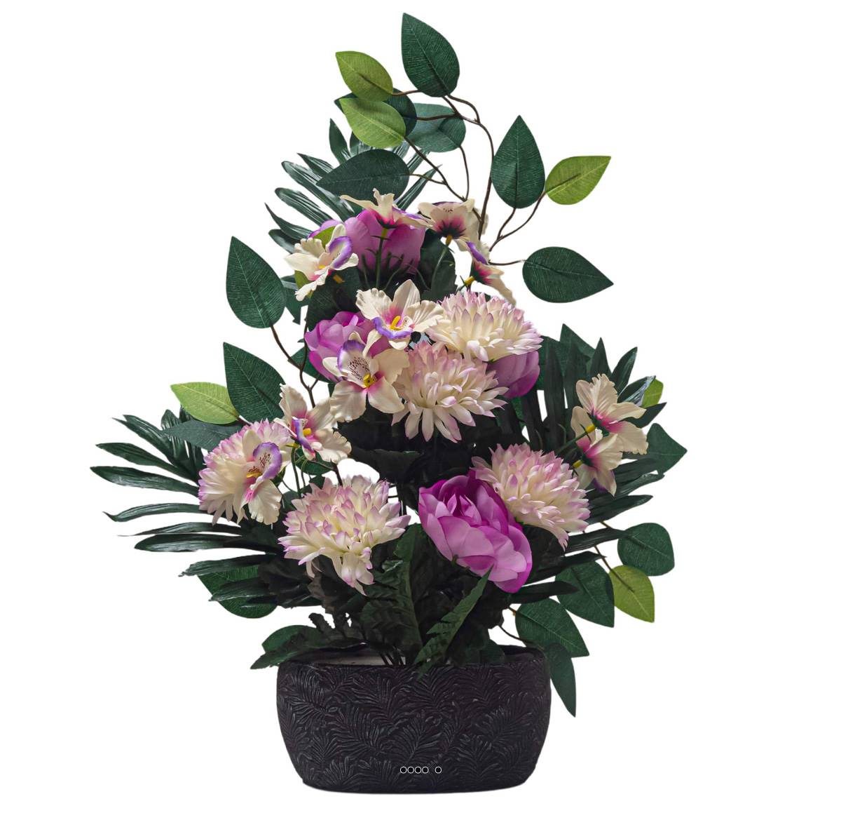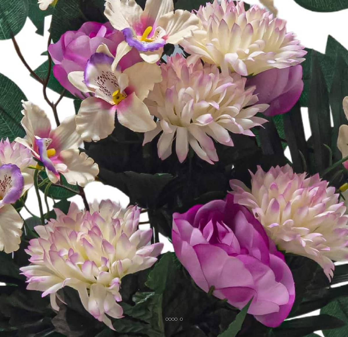 Cette composition est soigneusement réalisée avec des Roses artificielles, des faux Oeillets, d'Alstromarias factices, et un feuillage varié, sélectionnés pour leur réalisme et leur qualité.