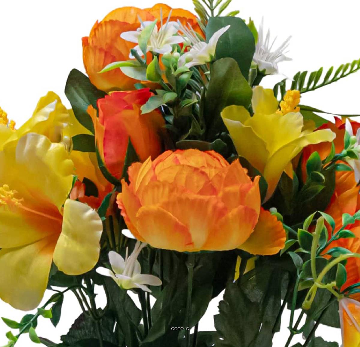 Cette composition est soigneusement réalisée avec des boutons de Pivoines artificiels, des faux Hibiscus et un feuillage varié, sélectionnés pour leur réalisme et leur qualité.