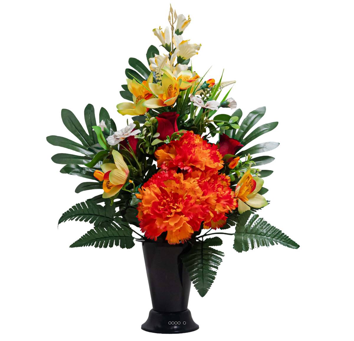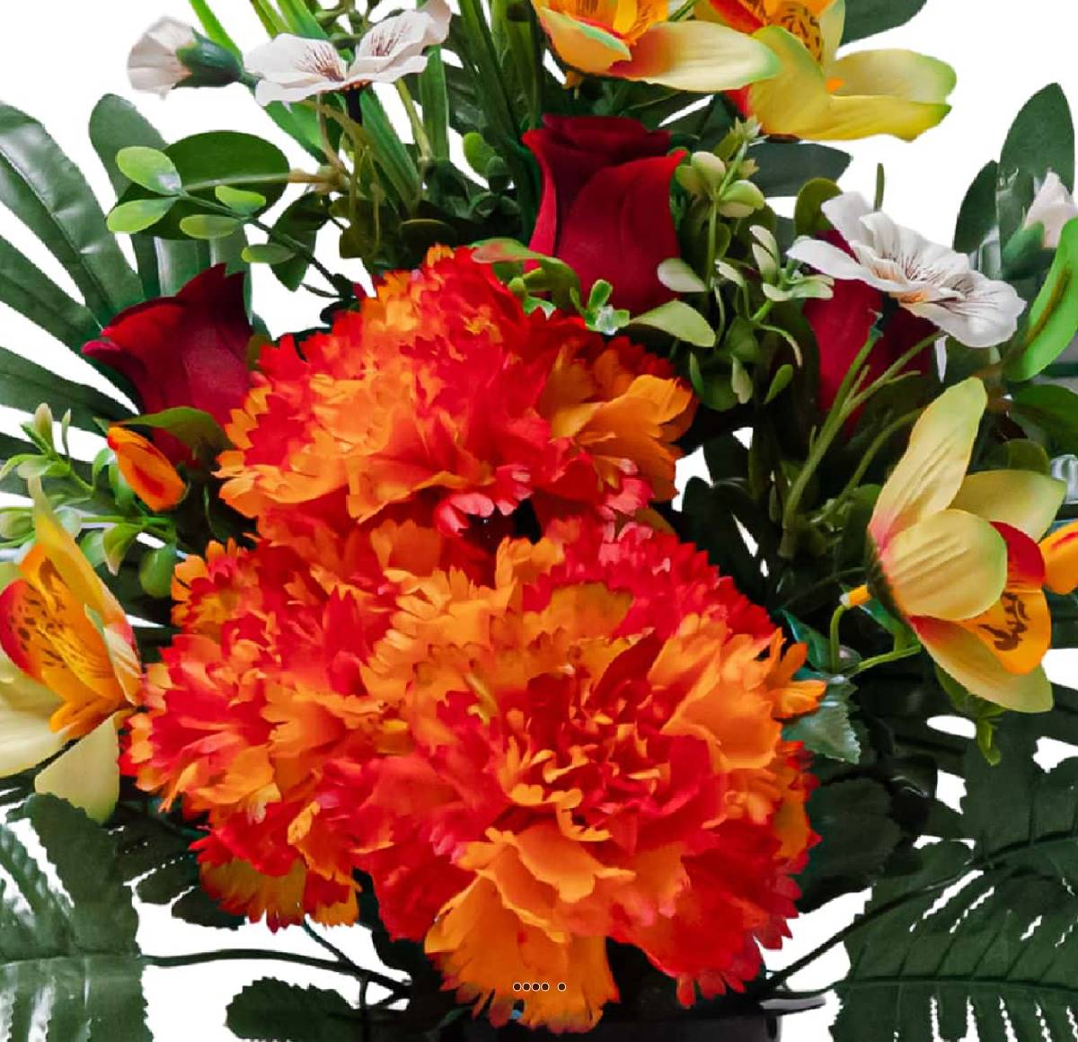 Cette composition est soigneusement réalisée avec des Oeillets artificiels, des faux boutons de Roses, des Orchidées factices et un feuillage varié, sélectionnés pour leur réalisme et leur qualité.
