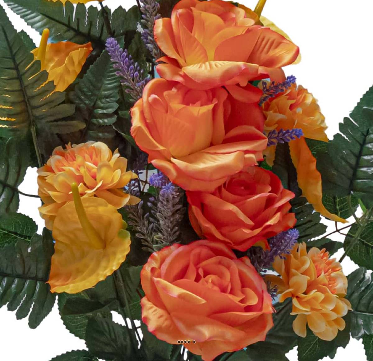 Cette composition est soigneusement réalisée avec des Roses artificielles, des dahlias, des Anthuriums factices et un feuillage varié, sélectionnés pour leur réalisme et leur qualité.