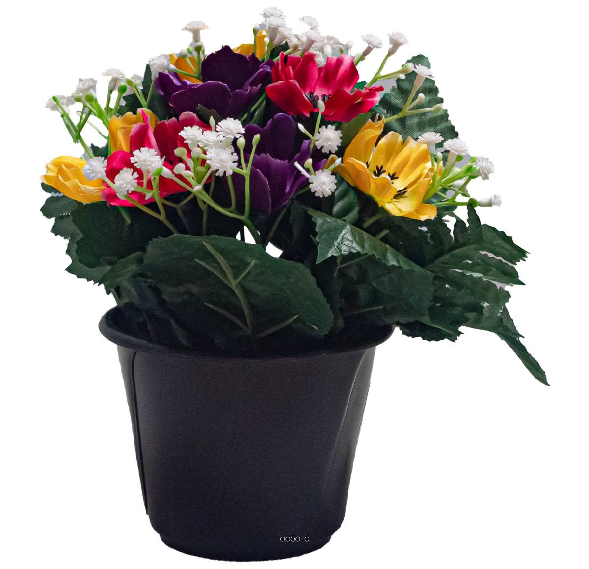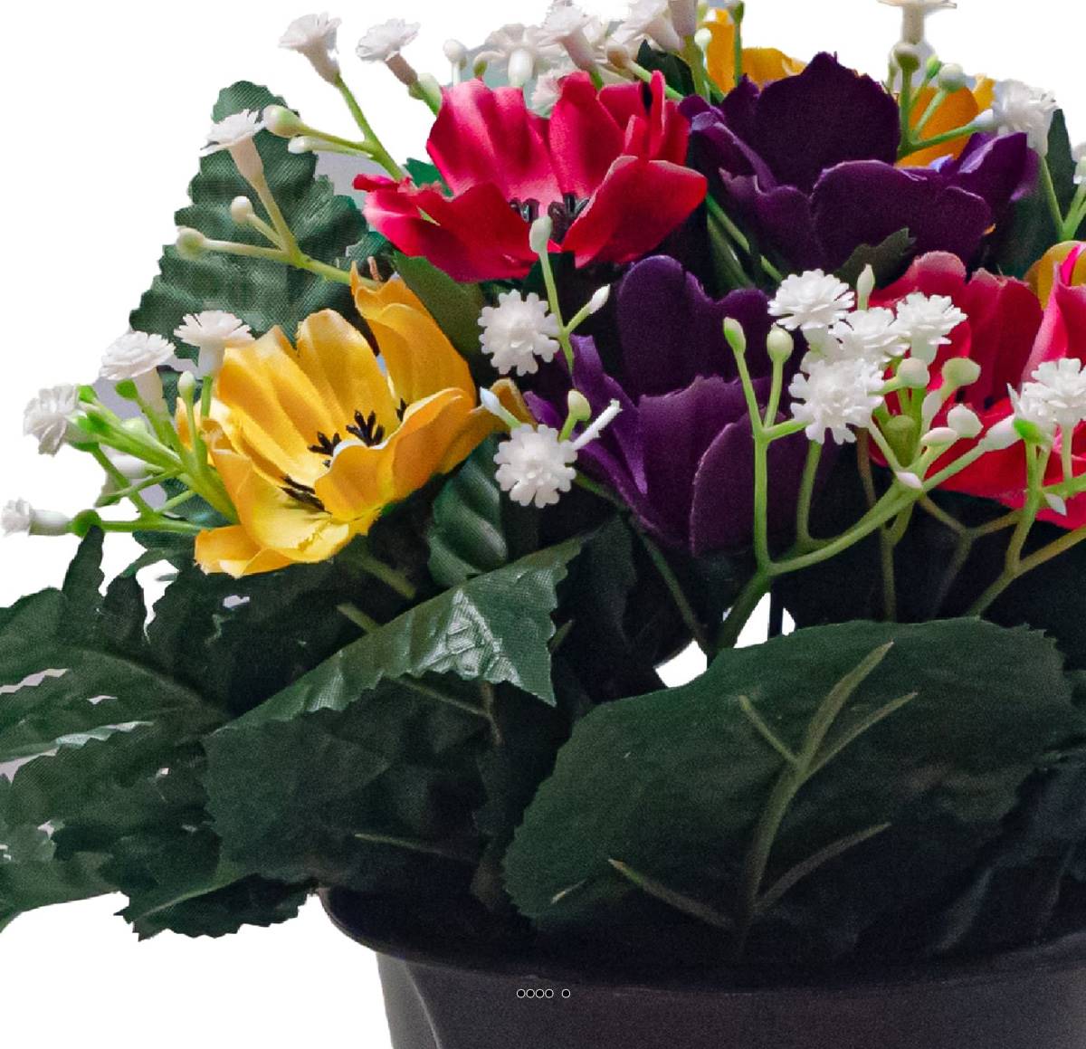Composition de la jardinière pour cimetière : Cette composition est richement garnie d'Anémones artificielles, de faux Gypsophile et de feuillage divers.