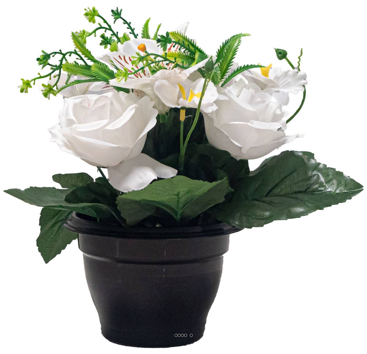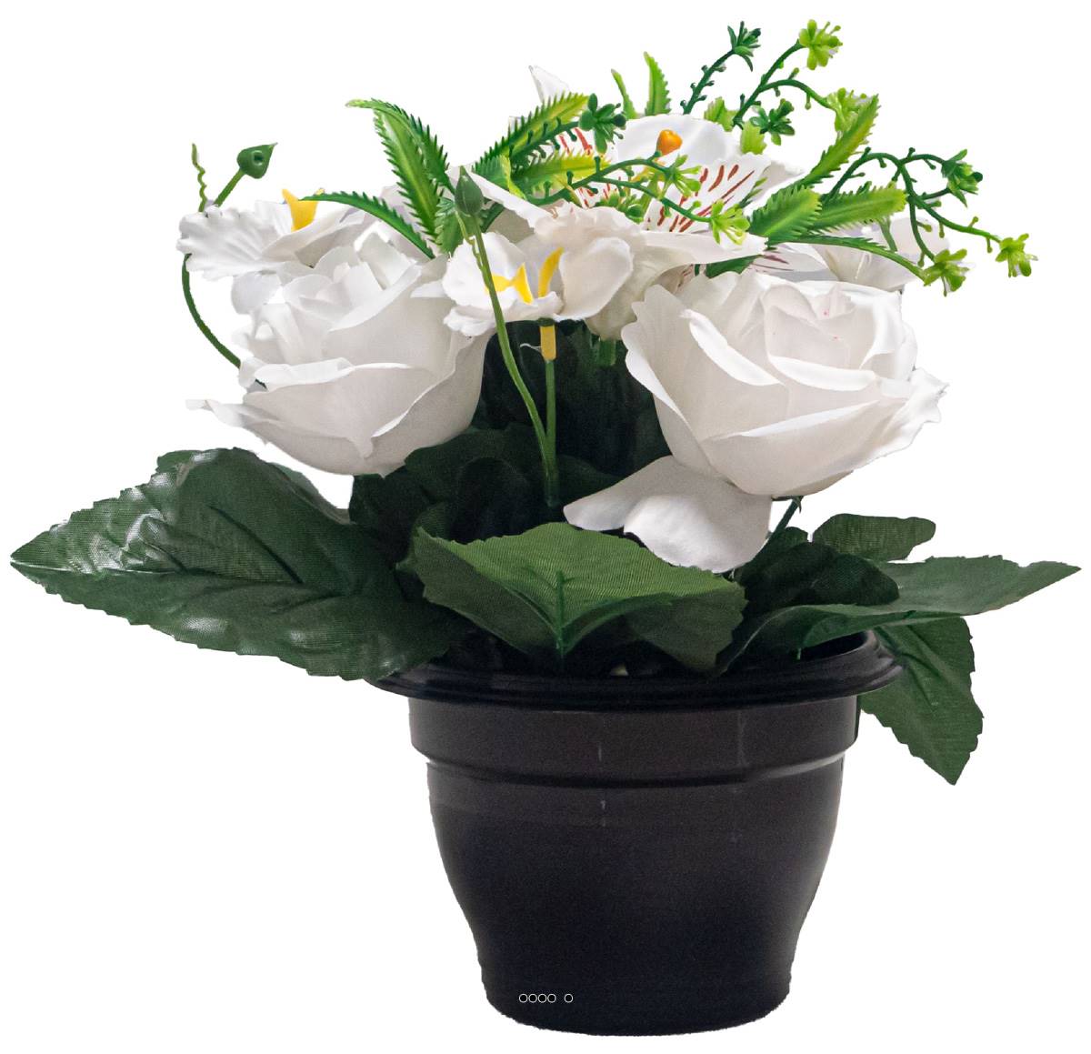 Pot de Roses fleurs artificielles pour le cimetière H 27 cm D 24 cm Blanc neige